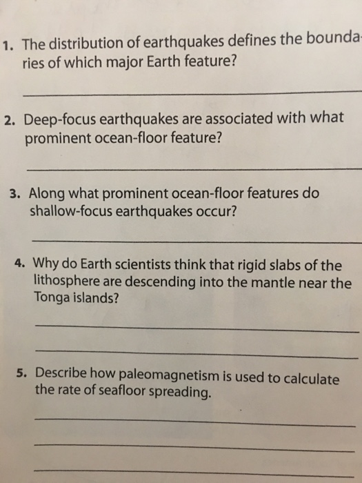Deep Focus Earthquakes Are Associated With What Ocean Floor Features. Along what prominent ocean-floor features do shallow-focus earthquakes occur. The arrangement of earthquakes defines the bounda- ries of which elder Earth lineament.